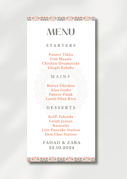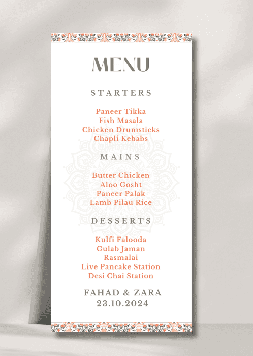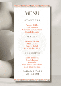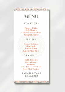 The card delicately displays your names and event date along with the delicious details of your starter, main course and dessert options.