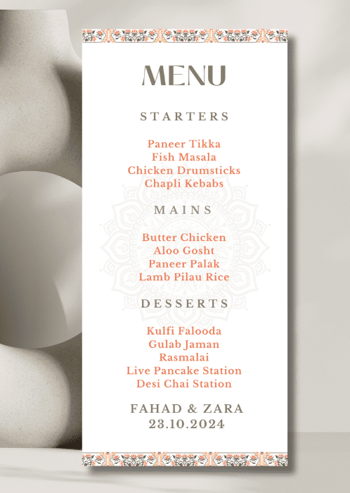 Our elegant Vibrant Orange Hues Menu announces all the dining details in store for your beloved guests. This beautiful design features orange hues with the floral borders framing the main details.
