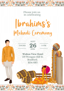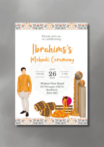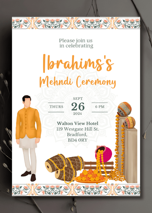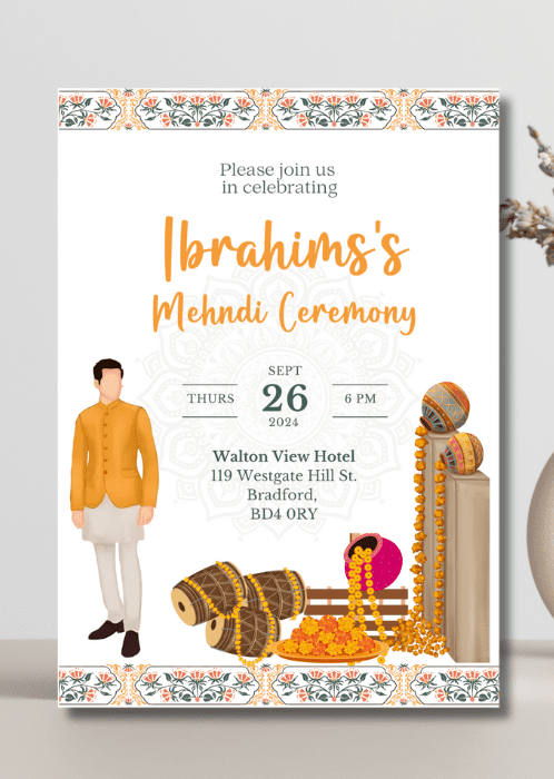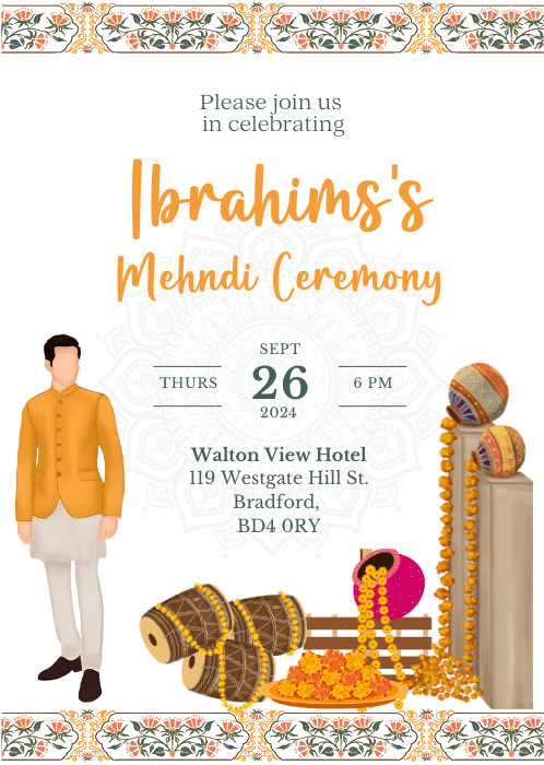 Welcome your guests in style with our Vibrant Orange Hues Mehndi Invitation. This vibrant design features orange hues with the floral borders framing the main details.