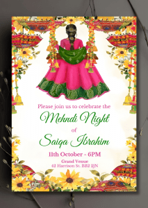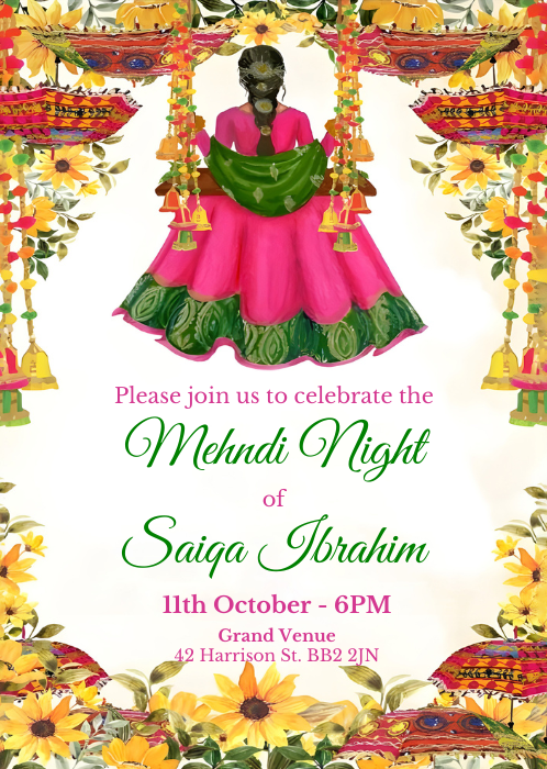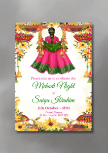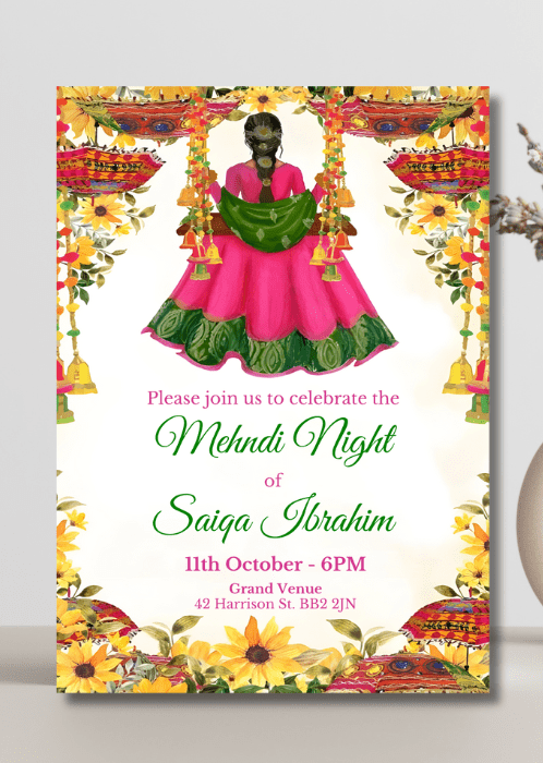 Set the tone for your upcoming event with our Vibrant Sunflower Mehndi Invitation. This vibrant invitation framed with sunflowers and adorned with delicate bells on the sides.