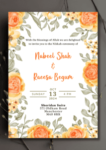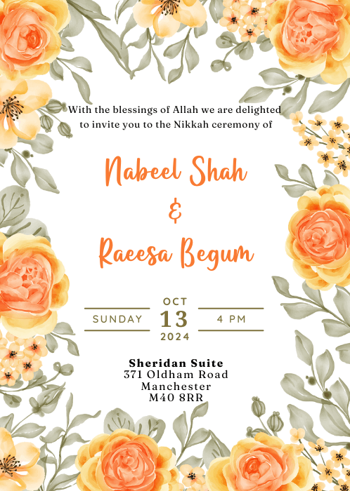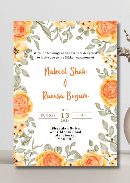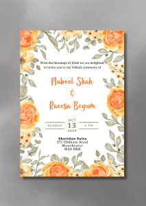 Set the tone for your upcoming wedding with our Warm Orange Hues Nikkah Invitation. The delicate floral watercolour roses rendered in a palette of warm orange and muted sage green bordering the details.