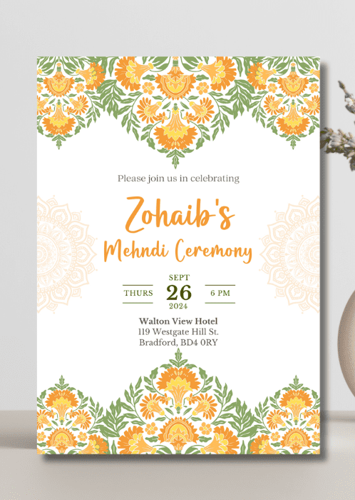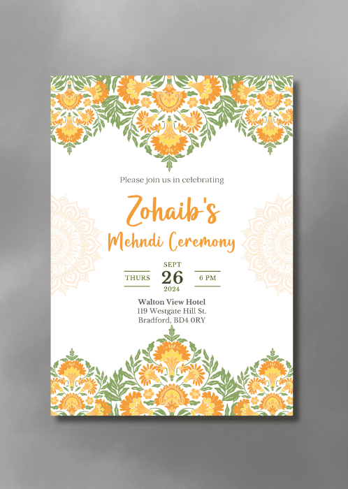 Set the tone for your upcoming event with our Warm Orange x Mandalas Mehndi Invitation. This invitation features intricate floral patterns rendered in warm oranges and yellows bordered by delicate mandala motifs.