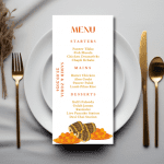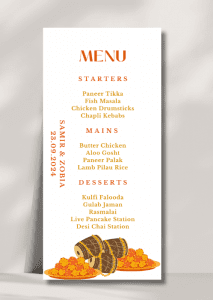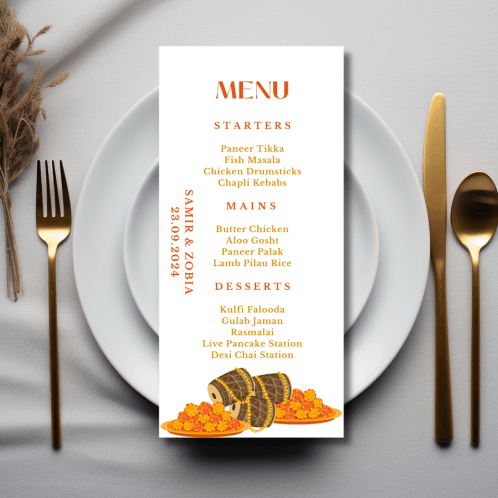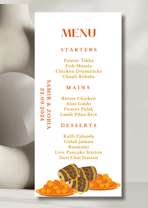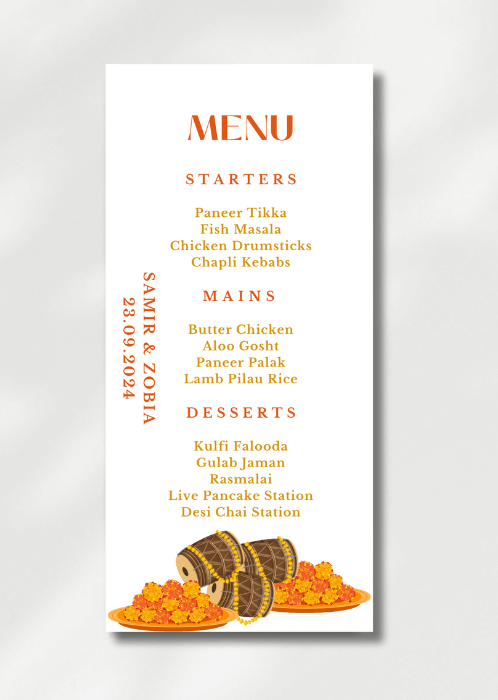 Our elegant Warm Orange x Marigold Menu announces all the dining details in store for your beloved guests. This beautiful design features a warm orange colour palette of marigolds and drums.