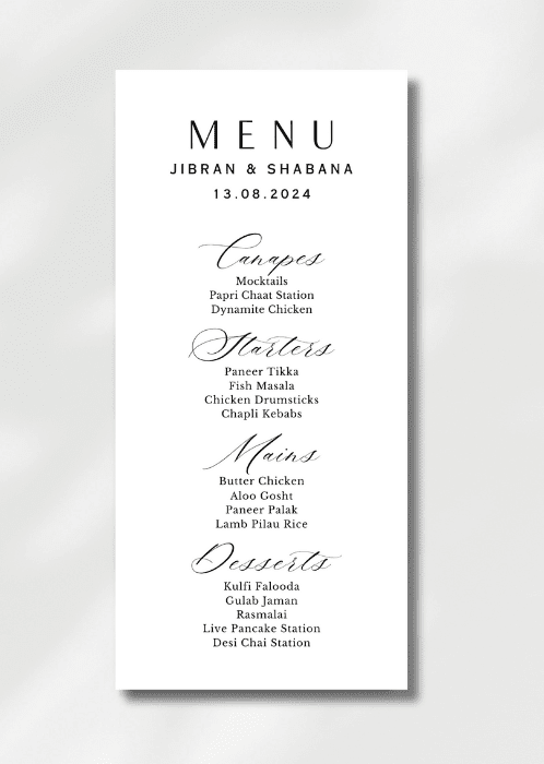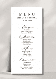 The card delicately displays your names and event date before disclosing the delicious details of your canapes, starters, main course and dessert options.