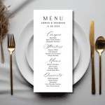 Our elegant White Minimalist Menu announces all the dining details in store for your beloved guests. This beautiful design features a simple minimal menu with a white background and black text.